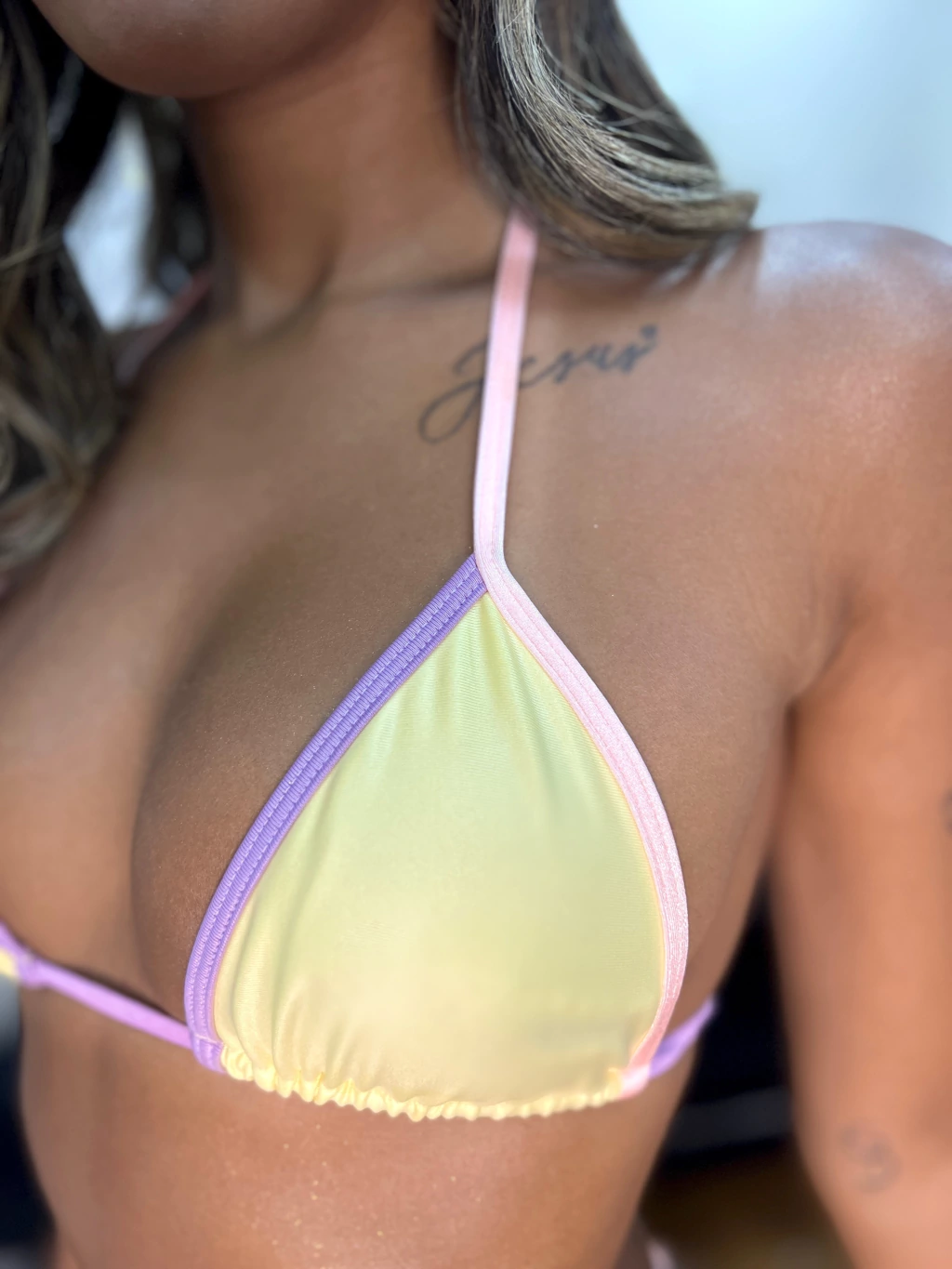 Prepare-se para arrasar no alto verão com o Biquíni Aruba, um top cortininha que combina elegância e conforto em um design exclusivo. A cor amarelo manteiga, super tendência da estação, traz uma vibe suave e iluminada, enquanto os detalhes em lilás e salmão nas amarrações e no viés adicionam um toque de charme delicado e moderno.