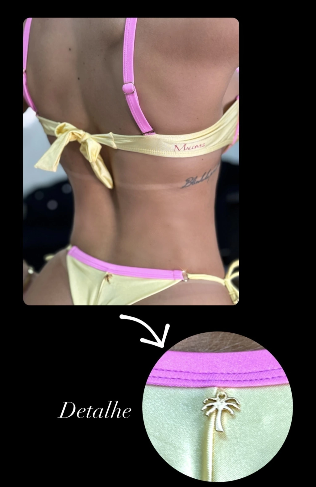 Descubra o charme do Biquíni Juice, confeccionado em sofisticada cor amarelo manteiga, tendência absoluta da temporada. Seus detalhes em viés rosa bebê conferem uma delicadeza única, tornando a peça perfeita para quem busca requinte e estilo à beira-mar.