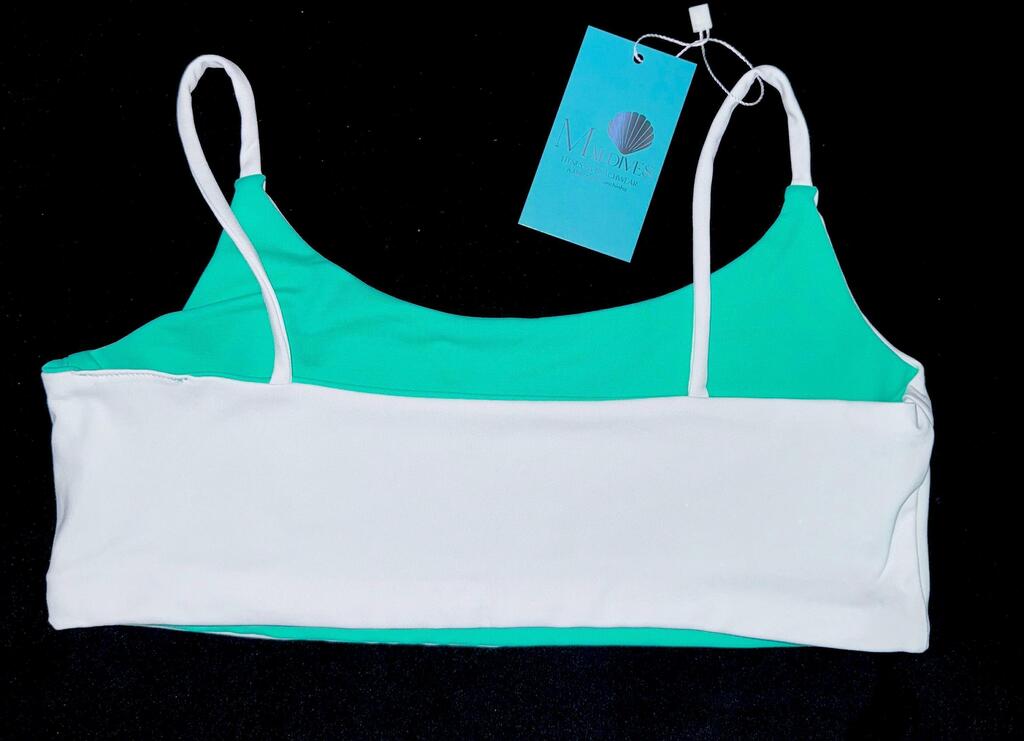 O destaque fica por conta do logo em formato de concha refletiva na parte branca, que confere um charme único, enquanto o logo Maldives na parte verde água adiciona um toque de frescor e originalidade. As alças elásticas garantem um ajuste seguro e confortável, e o elástico no cós abraça delicadamente o busto, valorizando suas curvas com sutileza.